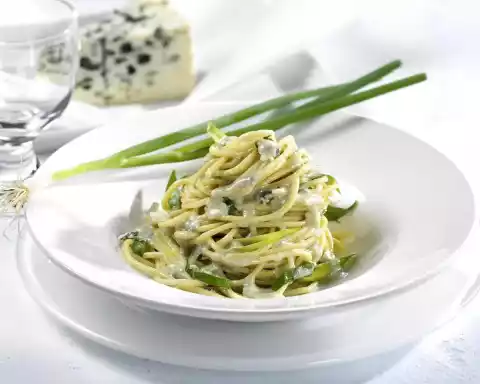 Season to taste with salt and pepper. Wash the basil, dab dry and remove the leaves and cut into strips. Stir the basil into the sauce. Fold spaghetti into the Roquefort basil sauce, heat up and serve.