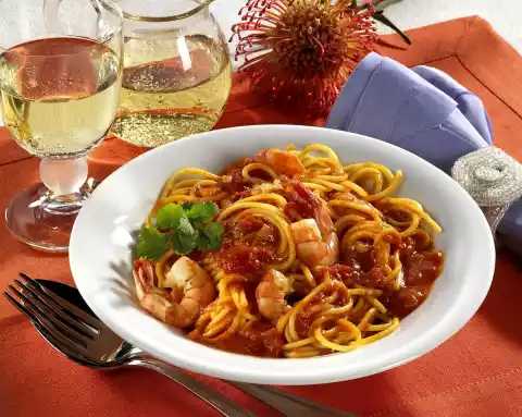 Drain the pasta and let it drain. Arrange noodles, sauce and prawns on plates. Serve garnished with coriander.