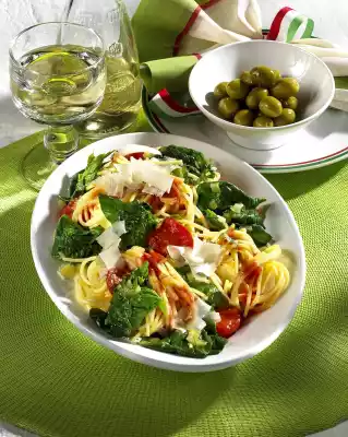 Heat the oil in a coated pan. Sauté the onion and garlic in it. Add the spinach and let it collapse. Steam the tomatoes briefly. Add tomato juice and bring to the boil. Season to taste