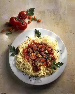 Peel and chop the onion. Fry onion and minced meat in hot oil. Season with salt and pepper. Add soup vegetables and cook for about 3 minutes. Coarsely chop the tomatoes in the tin and add to the minced meat.