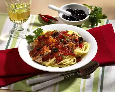 Cut the dried tomatoes into cubes. Pluck tuna into large pieces. Stir chilli, olives, parsley, capers, dried tomatoes and tuna into the tomato sauce. Drain the pasta and arrange on plates with the sauce.