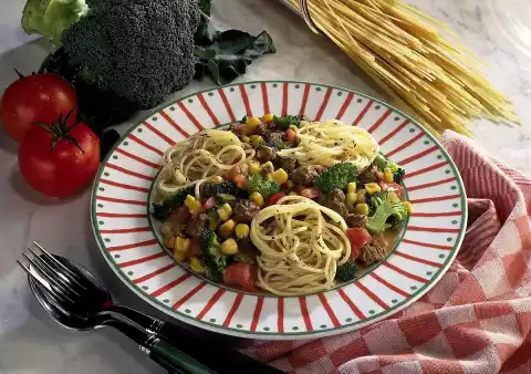 Cook the pasta in plenty of boiling salted water for ten to twelve minutes. Heat the oil in a pan. Fry the onions, broccoli cubes and minced meat in it. Pour in the broth. Add broccoli florets, tomatoes and corn grains.