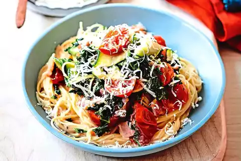 Bring 3-4 l salted water (1 teaspoon salt per litre) to the boil. Wash and halve the tomatoes. Clean and wash the zucchini and cut into thin slices. Sort and wash the spinach. Peel garlic and cut into slices.