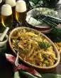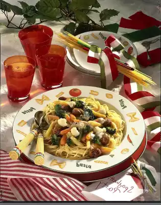Stir the crème fraîche into the sauce. Drain the spaghetti and mix with the vegetable sauce. Arrange everything on plates