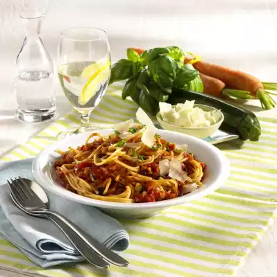 Wash, pluck and finely chop the basil. Slice or grate the parmesan. Stir half the basil into the sauce. Drain spaghetti and serve with the sauce. Sprinkle the rest of the basil and parmesan on top