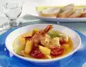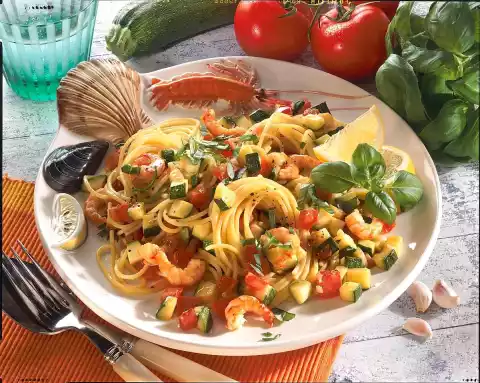 Peel garlic and dice finely. Heat the oil in a pan. Fry the zucchini, tomatoes, garlic and shrimp meat briefly. Drain spaghetti, drain well and add. Wash the basil, pluck the leaves from the stalks and chop finely, except for a little bit for garnishing.