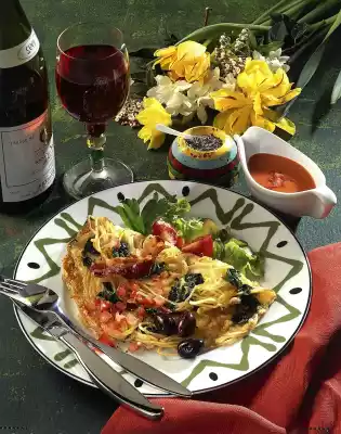 Arrange pancakes, bacon, diced tomatoes and olives on a plate and sprinkle with coarse pepper. Serve garnished with tomato wedges, parsley and salad. Serve with extra sauce.