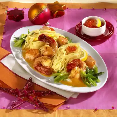 Refine with cream and season with salt and pepper. Cook the pasta in plenty of boiling salted water for about 5 minutes. Heat butter and fry spring onions for about 3 minutes. Arrange spaghettini with salmon, prawns, spring onions and the prosecco sauce on small plates or platters.