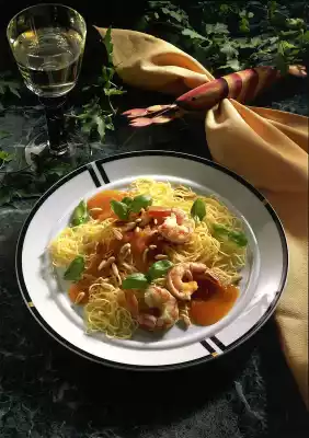 Roast pine nuts dry in a pan until golden yellow. Arrange spaghetti with the sauce and scampi. Serve with the remaining basil and the pine nuts.