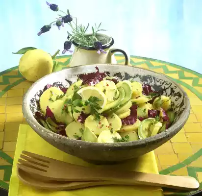 Clean, wash and drain the radicchio. Pluck leaves into bite-sized pieces. Wash parsley, dab dry and chop the leaves coarsely. Cut the avocado in half, remove the core and peel, or use a tablespoon to remove the skin. Cut avocado halves into slices. Season potato salad again with salt and lemon pepper and fold in radicchio, parsley and avocado just before serving. Garnish salad with pink pepper berries