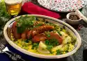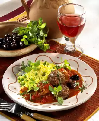 Fry the balls for about 5 minutes. Then add to the sauce and cook for another 5 minutes. Wash the parsley, cut into fine strips and sprinkle over the sauce. Season again and serve in portions garnished with olives and fresh marjoram. Serve with saffron rice with peas