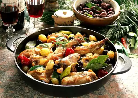 Wash the meat. Cut off abdominal flap. Cut the rabbit into about 8 pieces. Drain olives and pepperoni. Peel shallots and garlic. Heat the oil. Brown meat and belly rags.