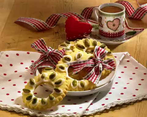 Roll out dough on a floured work surface to a thickness of 3-4 mm. Cut out plates with a round cookie cutter (8 cm Ø) with a wavy edge and place them on 3-4 baking trays covered with baking paper. Cut out the middle of the dough plates with a smooth, round cookie cutter (4 cm Ø) and lift out. Knead the dough remains together, roll out again and cut out wreaths as described. Bake the plates one after the other in a preheated oven (electric range: 175 °C/ convection oven: 150 °C/ gas: level 2) for approx. 10 minutes. Pull the wreaths with the baking paper from the baking tray and let them cool down on cake racks. To decorate, mix 2-3 tablespoons of hot water and icing sugar to a smooth glaze. Pour the icing into a small freezer bag, cut off a small corner and spray the icing onto the wreaths in a loop. Put the pistachios into the bows and press them on.