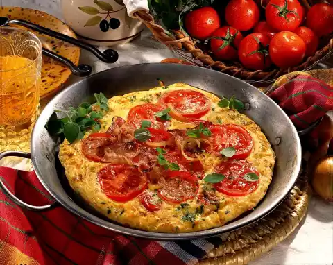 Wash, clean and slice the tomatoes. Peel, halve and slice the onions. Wash the oregano and remove the leaves. Put something aside for garnishing. Whisk eggs and milk. Season with salt, pepper and oregano