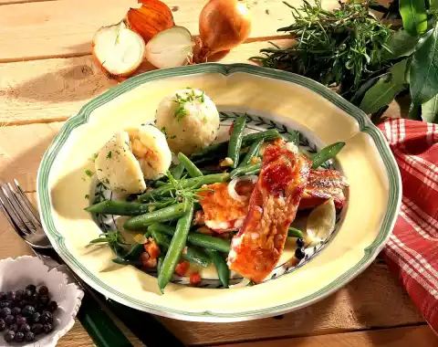 Season with salt, pepper and nutmeg. Bring to the boil briefly. Arrange beans, dumplings and spare ribs on plates. Sprinkle dumplings with chives.