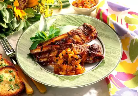 Bring to the boil while stirring. Then let it boil down a little bit in an open pot for about 20 minutes. Rub spare ribs with oil, salt and pepper and grill on the hot grill for about 15 minutes, turning occasionally.