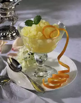 freeze in the freezer for approx. 45 minutes, stirring 3 to 4 times. Fill into glasses, decorate with lemon balm and orange