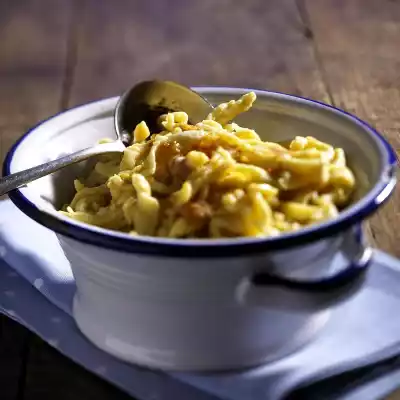 Process the remaining dough in the same way. Peel onions and cut into rings. Heat clarified butter in a pan. Fry the onion rings in it until golden brown and take them out. Put butter into the pan and melt it, stir in breadcrumbs. Arrange spaetzle in a bowl. Add the onion rings and pour the crumble butter over them