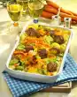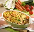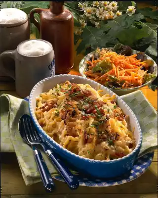 Mix the spaetzle and bacon and place in an ovenproof dish. Sprinkle cheese over it and bake in the preheated oven (electric: 200 °C/ gas: level 3) for approx. 20 minutes. Peel and coarsely grate the carrots.