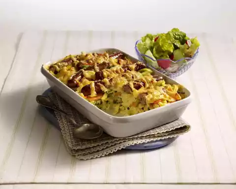 Let simmer for about 1 minute while stirring. Season béchamel with salt, pepper and nutmeg. Put the vegetable noodles in an ovenproof dish and pour the sauce over them. Grate cheese. Spread the sausages on the casserole, sprinkle with cheese. Bake in the preheated oven (electric cooker: 200 °C/ convection oven: 175 °C/ gas: level 3) for about 20 minutes. Serve with fresh salad