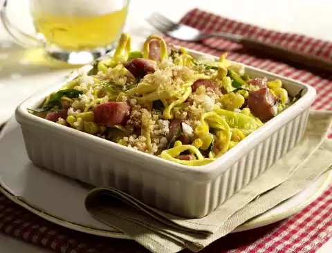 Heat the oil in a pan, fry the meat briefly while turning, remove. Whisk eggs and milk, season with salt, pepper and nutmeg. Drain spaetzle, leek and corn, let drain. Mix with the Kasseler.