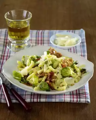 Prepare the spaetzle in boiling salted water according to the instructions on the packet. Drain bacon in a pan without fat for 3-4 minutes, remove. Add Brussels sprouts, garlic and thyme to the pan. Fry for about 2 minutes. Add cream, bring to the boil and simmer for about 3 minutes. Season to taste with salt, pepper and lemon juice. Mix spaetzle and bacon into the sauce and arrange on 4 plates. Sprinkle with parmesan