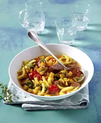 Add the spaetzle and sausage to the stew and warm it up for about 4 minutes. Wash thyme, shake dry, pluck leaves from the stems and chop. Add tomatoes and thyme to the stew, season with salt and pepper. Arrange stew in bowls. Crème fraîche tastes good with it