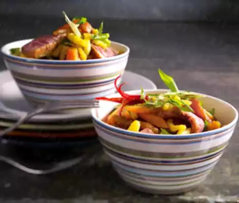 ##carrots## and spring onions peel or clean and wash. Halve carrots lengthwise and cut into thin diagonal slices. Cut spring onions into slanted rings. Cut 1 ##chilli pepper##, remove seeds, wash and chop.