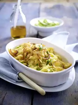 Press the spaetzle dough in portions through a spaetzle press into the water. Bring to the boil until the spaetzle rise to the surface. Remove the spaetzle with a skimmer, quench in a sieve, drain and keep warm. Mix the spaetzle with cheese and put into an ovenproof dish. Bake in a preheated oven (electric cooker: 200 °C/ circulating air: 175 °C/ gas: level 3) for approx. 10 minutes until the cheese has melted. Peel onion and cut into thin rings and turn in 1 tbsp. flour. Heat butter, fry onion rings in it until golden brown. Wash parsley, shake dry, pluck leaves from the stalks and chop. Take out the spaetzle. Add the onion rings.