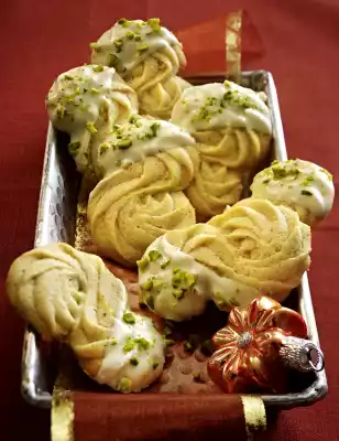 Pour the dough into a piping bag with a star-shaped spout (10 mm Ø) and distribute it in 4-5 cm long S-shaped forms on 2-3 baking trays lined with baking paper. Bake one after the other in a preheated oven (electric cooker: 175 °C/ convection oven: 150 °C/ gas: level 2) for about 15 minutes. Take out the biscuits and let them cool on the baking tray