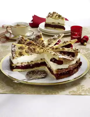 Stir in 3/4 of the egg whites. Fold in the remaining beaten egg whites. Spread 1/3 of the dough evenly into the springform pan, sprinkle with 1/3 of the Spekulatius crumbs. Bake in the preheated oven (electric cooker: 200 °C/ convection oven: 175 °C/ gas: level 3) for approx. 10 minutes. Remove from the springform pan immediately and let cool on a cake rack. Bake 2 more bases in the same way. Remove from the tin immediately. Cut 1 cake base while still warm into 12 pieces (fans) immediately. Pour the cherries into a sieve and drain. Stir 5-6 tablespoons cherry juice, starch and 50 g sugar until smooth. Bring the rest of the cherry juice to the boil, stir in the mixed starch, bring to the boil and simmer for about 1 minute while stirring. Add the cherries. Remove 3 tablespoons and cover immediately with foil.