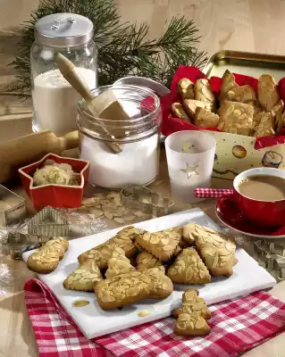 Cream butter, diabetic sweetener and egg with the whisk of the hand mixer. Stir in spices, lemon peel and ground almonds. Mix flour and baking powder and knead with the dough hooks of the hand mixer. Form the dough into a ball with your hands, wrap in foil and chill for approx. 4 hours. Roll out the dough between 2 layers of baking paper to a thickness of approx. 5 mm. Peel off the top paper. Cut out the dough with different cutters and put it on 2 baking trays lined with baking paper. Sprinkle almond flakes on top and press lightly. Bake the trays individually in a preheated oven (electric range: 200 °C/ convection oven: 175 °C/gas: level 3) for approx. 10 minutes. Remove and let cool on a cake rack