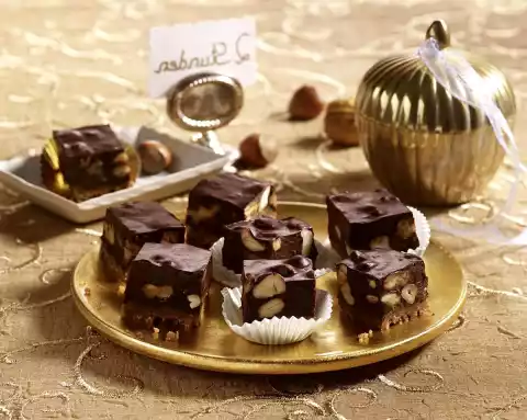 Roughly chop the chocolate. Heat cream and 25 g butter in a saucepan (do not bring to the boil). Melt chocolate in it. Stir nuts into the chocolate and spread on the speculoos base. Chill the cake for 1 1/2 hours, then cut into small cubes with a hot knife