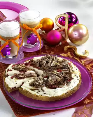 Put in a cool place for about 1 hour. In the meantime, chop the chocolate coating and melt it in a hot water bath. Spread thinly on a board, put in a cool place and let it set. For the filling, soak gelatine in cold water. Drain the cranberries. Mix yoghurt, sugar and lemon juice. Squeeze out the gelatine, dissolve lukewarm and mix thoroughly. Whip the cream until stiff and allow the vanillin sugar to trickle in. Fold into the cream. Fold in cranberries. Spread on the base and chill for another hour. Carefully remove from the springform pan.