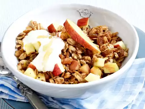 Add sultanas and apple cubes to the pan. Pour on 4 tbsp. water and let it swell in the closed pan for about 5 minutes. Let it cool down. Arrange muesli and yoghurt in a bowl, drizzle with honey and decorate with apple wedge.