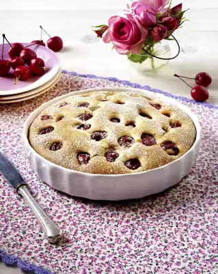 Grease the porcelain pie mould (22 cm Ø). Add the dough and smooth it down. Spread cherries on it and press them in. Bake in the preheated oven (electric cooker: 175 °C/ convection oven: 150 °C/ gas: level 2) for approx. 45 minutes (stick test)