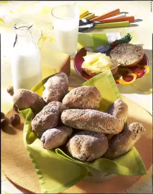 Add nuts and knead. Form 6 round and 6 longish rolls with well floured hands. Place on two baking trays lined with baking paper and bake in the preheated oven (electric range: 175 °C/ gas: level 2) for 25-30 minutes one after the other.