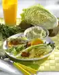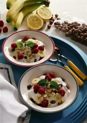 Arrange in four bowls. Add the rest of the yoghurt. Sprinkle with fruit, nut leaves and raisins. Decorate with some lemon balm if you like.