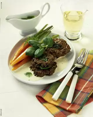 Coarsely chop half of the basil. Mix with cream cheese and chili and stir into the spelt mush. Season with salt, pepper and dried herbs. Whisk the egg, stir in. Knead mass with flour and form about 10 flat roastings with floured hands. Fry in hot oil for about 2 minutes on each side. Meanwhile, for the sauce, peel and finely dice the shallots and fry them in the remaining hot fat. Deglaze with cream and 200 ml of the vegetable stock and simmer for about 5 minutes. Sprinkle with sauce thickener. Season to taste with salt and pepper. Pluck basil leaves and stir into the sauce. Serve the roasts, carrots and sauce with basil and garnished with tender carrot green to taste