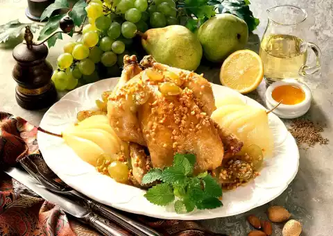 Flip the grapes in it. Mix honey and aniseed and coat the poulard with it ten minutes before the end of the cooking time. Drain the pears and cut them in a fan shape. Arrange the poulard with the grapes and pears on a plate.