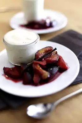 Preheat oven (electric cooker: 200 °C/circulating air: 180 °C/gas: level 3). Cut the plums in half lengthwise and remove the stone (defrost the frozen plums). Cut the vanilla pod lengthwise and scrape out the pulp. Slowly heat wine, cane sugar, spices, ginger, citrus peel and vanilla pulp and pod while stirring until the sugar has dissolved. Add the plums. Put everything into an ovenproof dish and cook in the oven on the lowest shelf for about 20 minutes