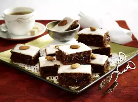 Remove from the baking tray with large dough pallets. Carefully lift one half down and place on a board. Mix the jelly and spread on the cake half. Carefully place the second pastry sheet on top, press down lightly. Stir icing sugar, rum and 2 tbsp. water until smooth. Spread on the cake and let it dry. Cut into pieces and decorate with almonds