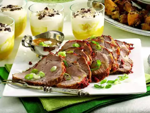 Clean, wash and cut the spring onions into rings. Remove the roast and keep warm. Sieve the stock. Add the rest of the ajvar and cream and bring to the boil. Thicken the sauce. Stir in spring onions, except 2 tbsp. for garnishing. Simmer briefly. Arrange everything and garnish. Bread and coleslaw are delicious with it.