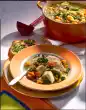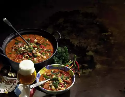 Add strips of paprika, chilli, tomatoes with juice and 3/4 litres of water. Chop the tomatoes slightly. Bring everything to the boil and dissolve the stock in it. Drain the beans and silverskin onions. Cook for ten minutes.