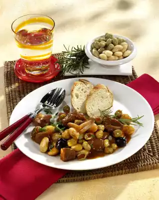 Drain the beans and olives. Add a few minutes before the end of cooking time and warm up as well. Stir the sauce thickener into the goulash and thicken with it. Season to taste with salt and pepper. Serve garnished with the herbs set aside.