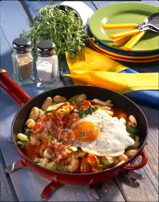 Remove from the pan. Add the fat to the pan, heat it up, break the eggs and let them slide into the pan. Fry over medium heat. Season with salt and pepper. Garnish bean pan with thyme and serve with eggs and bacon.