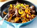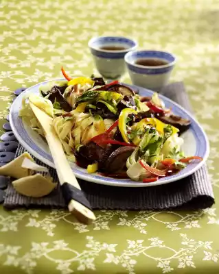 Heat 2 tablespoons of oil in a wok. Fry the meat in it in portions while turning, remove. Season with salt. Add 2 tablespoons of oil to the frying fat and heat. Fry the peppers for approx. 3 minutes. Add pak choi and mushrooms and fry for another 2 minutes.