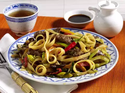 Heat oil in a wok. Season meat with salt and fry for 3-4 minutes, turning. Remove the meat. Add leek, paprika, bamboo shoots, chilli, ginger, mushrooms and garlic and fry for about 5 minutes.