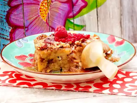 Remove the bread pudding from the oven and immediately add the caramel icing. Cut the bread pudding into about 6 pieces and serve warm. Decorate with raspberries if desired.