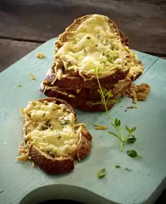 Grate hard cheese finely and mix with thyme leaves. Spread the baguette on a baking tray lined with baking paper and sprinkle with the cheese. Bake in a preheated oven (electric cooker: 225 °C/circulating air: 200 °C/gas: see manufacturer) for approx. 10 minutes until golden brown.